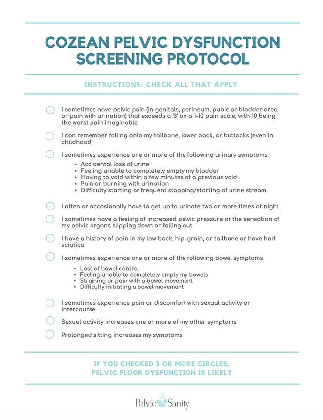 If ANYTHING isn't 'quite right' in your pelvic region, then pelvic physical therapy can help determine if any pelvic floor dysfunction is contributing to your symptoms. The follow questionnaire can help you consider some common causes and complaints associated with pelvic floor dysfunction.